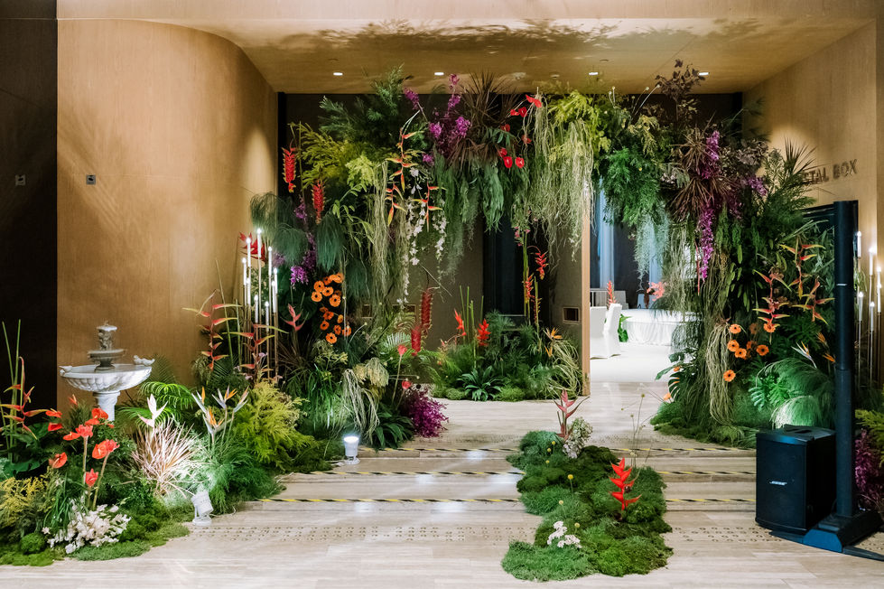 I guided the design process by curating precedent imagery and defining key thematic elements, collaborating closely with my wedding planner to bring the vision to life. The spatial design emphasized structured forms through built installations—a sculptural wedding arch, dramatic photo backdrops, and a striking reception stage—while celebrating Thailand’s native flora. Verdant rainforest textures were woven throughout, transforming the venue into an immersive indoor jungle with a modern twist.
